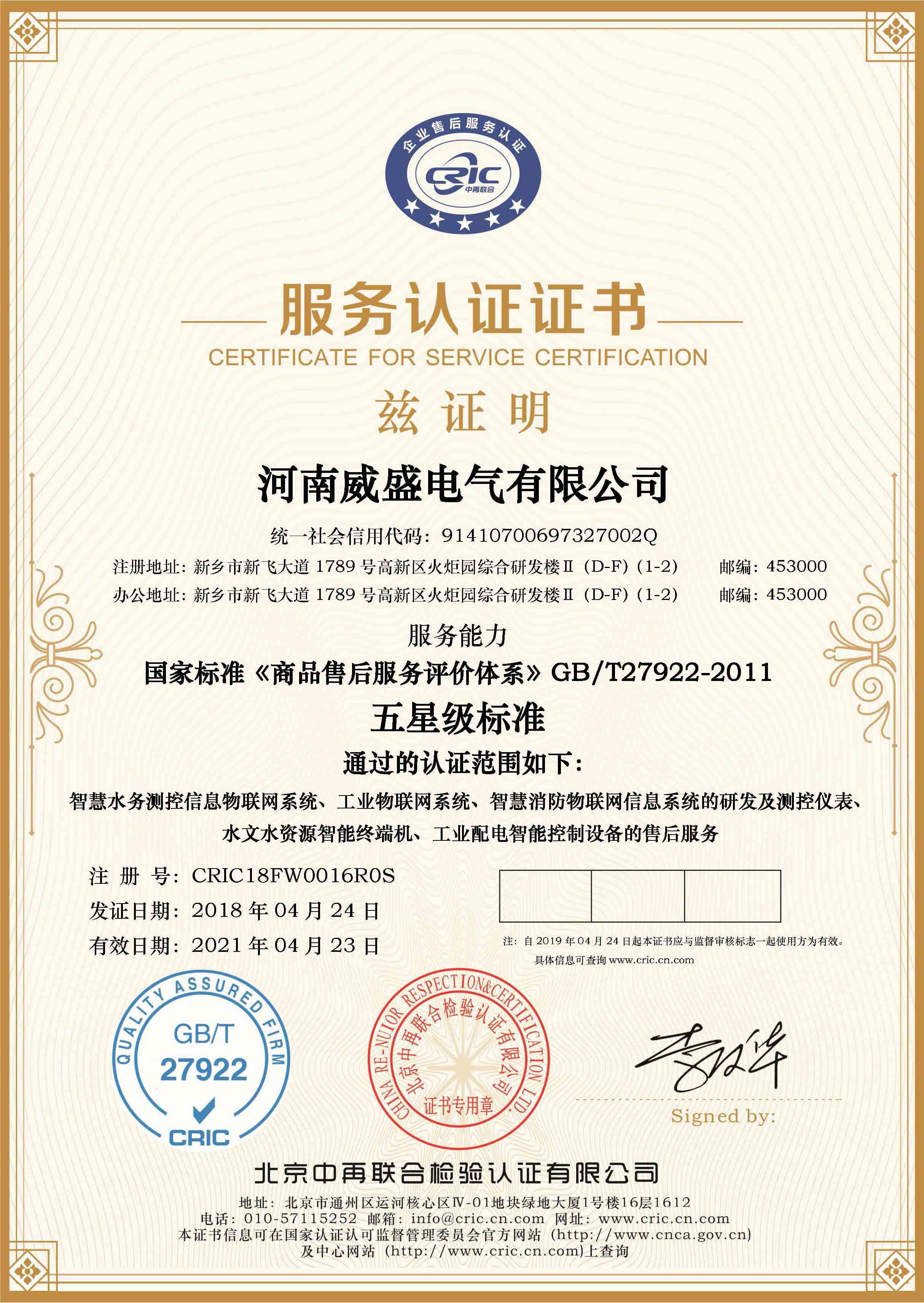 售后服務認證證書(五星)