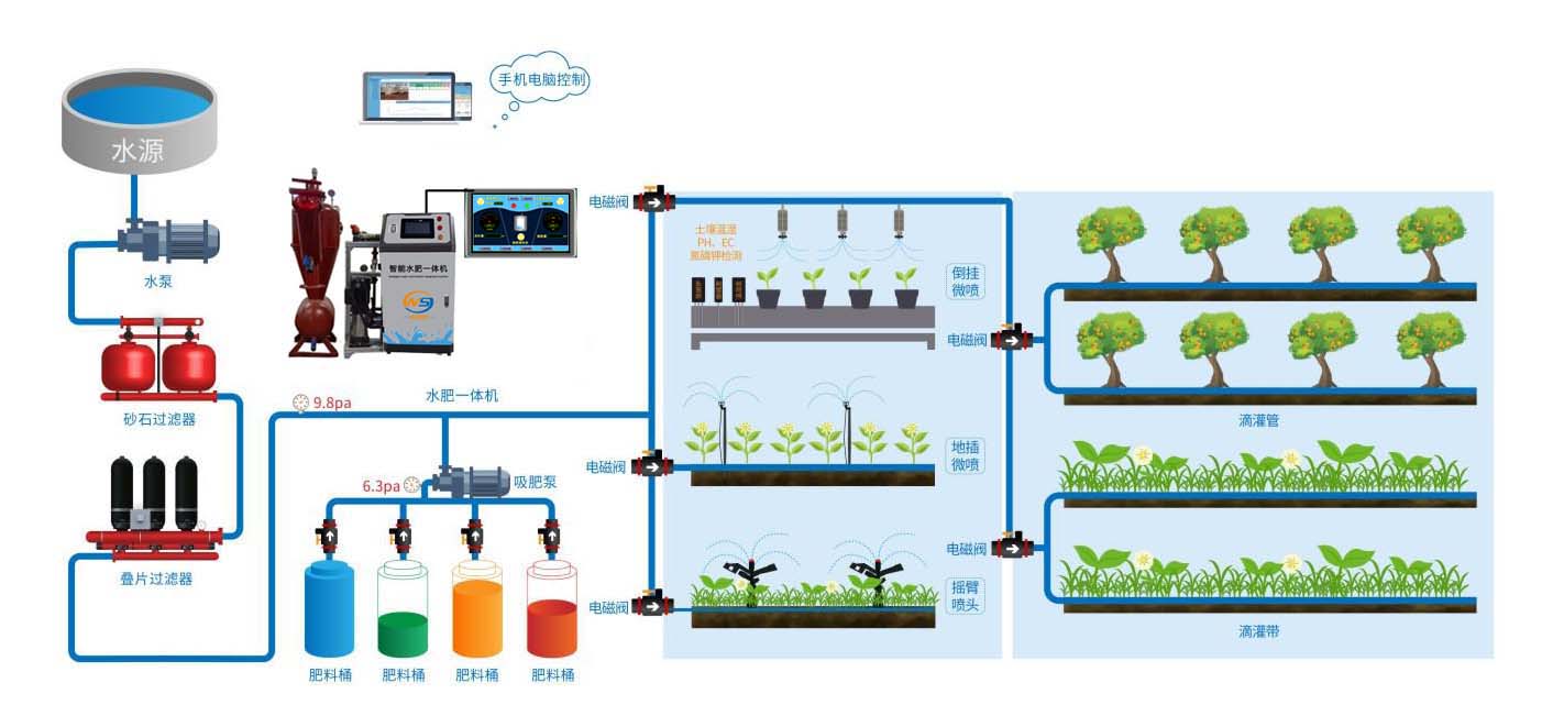 威盛水肥一體化智能灌溉控制系統(tǒng),它由主控系統(tǒng)、電磁閥接入系統(tǒng)、電源控制系統(tǒng)、吸肥管道系統(tǒng)、吸肥泵動(dòng)力系統(tǒng)等部件組成。該款智能施肥機(jī)在進(jìn)口施肥機(jī)的基礎(chǔ)上,根據(jù)所能實(shí)現(xiàn)的功能設(shè)計(jì)出更加符合我國(guó)國(guó)情的水肥一體化設(shè)備,水肥一體機(jī)讓我們的使用者更方便操作、簡(jiǎn)單易學(xué)。